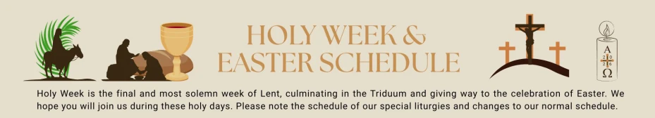 Holy Week begins with the memorial of Jesus’ entrance into Jerusalem to accomplish his Paschal Mystery. We celebrate this memorial by means of a solemn procession, outside the Church’s main entrance, before all the Masses,except for 7:00am Mass.